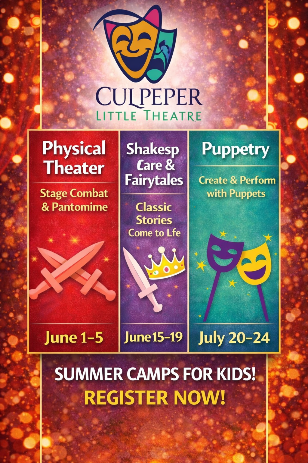 In partnership with Culpeper Parks and Rec we bring theater classes and a musical theater intensive for grades 3-5. Classes are happening now!