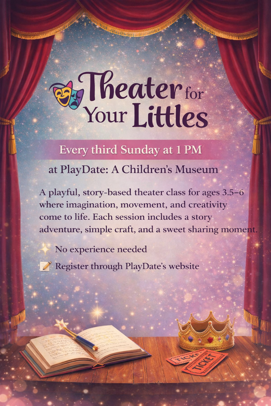 A playful, story-based theater class where children ages 3.5–6 build confidence, creativity, and social skills through imagination, movement, and storytelling.